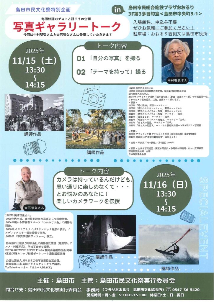 | 審査部門 | 文芸(短歌・俳句・川柳・随筆・小説・自由文・詩)、絵画、写真(自由作品、テーマ「島田市内の景観及び市内で働く人々」)、書道、ペン書道 |